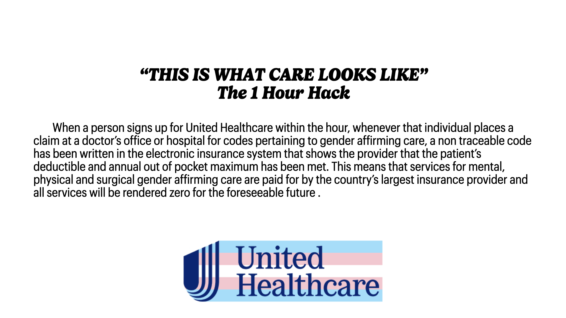 I would hack United Healthcare, the USA’s largest health insurance provider, to secure free gender-affirming care for anyone who signed up for coverage within the hour window. Below is how I would do it.